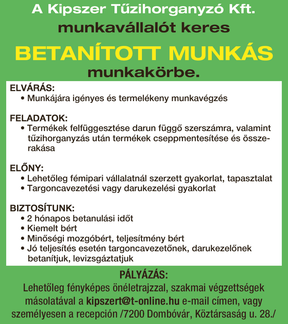 Betanított munkás Kipszer Tűzihorganyzó Kft.